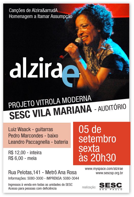 Nunca escrevi sobre o bom mais recente disco de AlziraE (outrora Alzira Espíndola) e Arruda. É dos vários bons discos sobre os quais não escrevi, mais por falta de tempo que por qualquer outra coisa. Aos amigos de SP, fica a dica para o show em que eles irão homenagear Itamar Assumpção. Sobre o disco, prometo escrever em breve.
