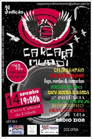 Carcaramundi: clara alusão a João do Vale, mestre dos maiores de sempre. Vários artistas reunidos. Um show para mostrar a produção musical alternativa do Maranhão, tão sem espaço em rádios. Negoka’apor, Célia Sampaio, Fogo, Cordas e Tarraxas, Arsenal MCs (de Balsas/MA), 5ª. Potência, Mythra, Banzeiro, Cravo da Ilha, Seno de Têta e Rádio Zion. Nesta sexta-feira (14), às 19h, no Circo Cultural da Cidade. Ingressos: R$ 10,00 (meia para estudantes com carteira).