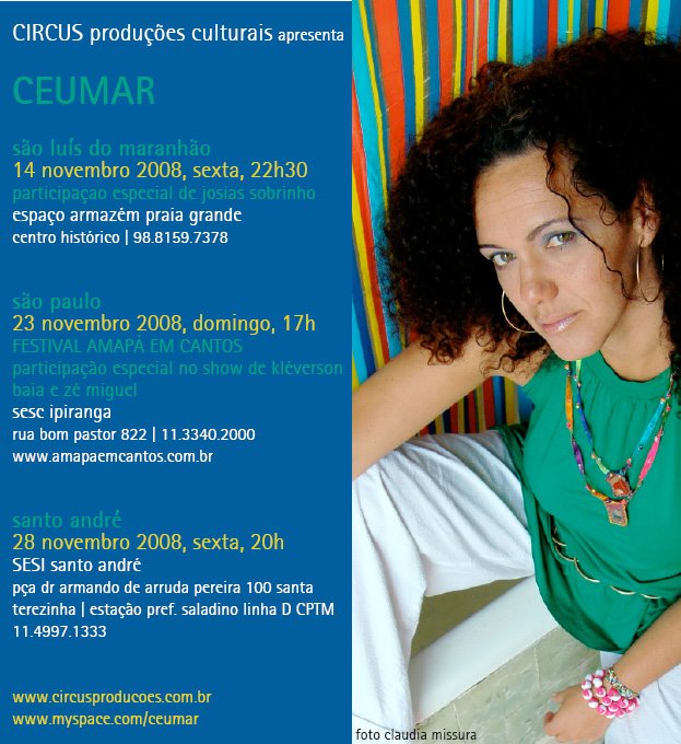 Amanhã (14), a partir das 22h, Ceumar apresenta show solo (voz e violão) no Espaço Armazém (Rua da Estrela, Praia Grande), com participação especial de Josias Sobrinho, que fará o show de abertura e cantará com ela As “perigosa”, composição do maranhense incorporada ao sempre ótimo repertório da mineira. Os ingressos custam R$ 30,00 e podem ser adquiridos no local. A produção é de Mário Jorge. São só 280 lugares, portanto, apressem-se!:
