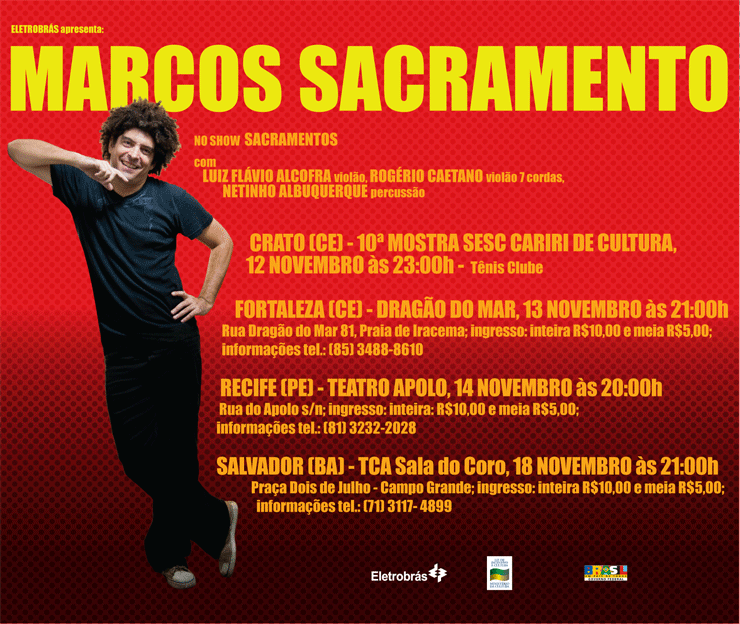 Se você mora em uma dessas cidades e lê este blogue, não perca, por nada, o show do Marcos Sacramento. Se você nunca ouviu falar nele, não se espante: rádios não tocam, tevês não mostram. Mas trata-se de um dos grandes intérpretes da música brasileira contemporânea. E isso, nem de longe, significa estar na moda. Se estivesse, é claro que rádios e tevês tocariam/mostrariam. E trocariam, quando o rapaz não mais servisse. Mas, amém, o trampo do cantor é outro. Seu repertório é de primeira desde o primeiro disco, e os instrumentistas que acompanham sua bela voz são simplesmente excelentes. Bom, não percam a oportunidade que eu, morando em São Luís, ainda não tive (alô produtores da Ilha!). Depois não digam que eu não avisei.