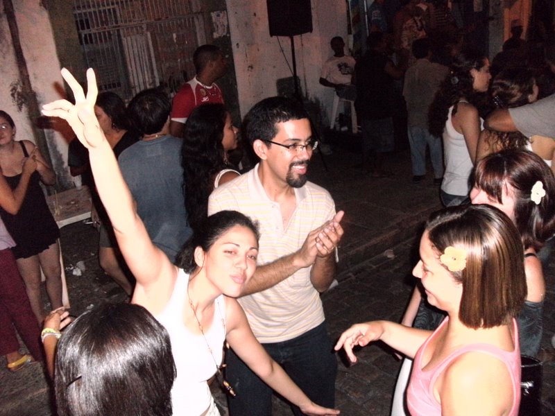 [A Vida é uma Festa!, dia 18 de dezembro. Já passava de meia-noite quando o blogueiro batia palmas, acompanhado por, em sentido anti-horário, Jordânia (simulando um voo), Nilra (os cabelos sem corpo que aparecem na foto), Graciane e Graziela; depois (ou antes?), Jordânia subiu ao palco e cantou os parabéns, acompanhada de ZéMaria Medeiros e banda Casca de Banana]