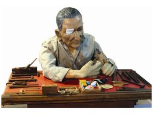 [Reprodução do ambiente de trabalho, exposta em vitrine na Casa de Nhozinho. Bancada original doada pela família. Reprodução do livro]