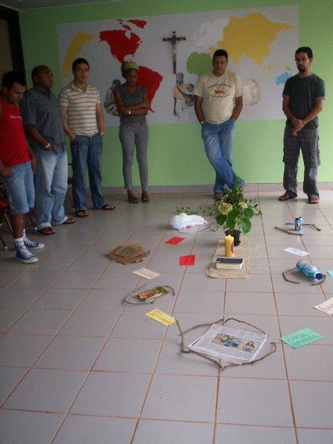 [Parte da equipe de trabalho durante mística de abertura das atividades de 17/4/2009. O blogueiro, barbudo e despenteado, é o último à direita]