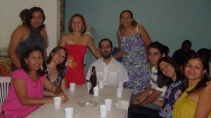 [No aniversário de Graciane, da esquerda para a direita: em pé: Neta, a aniversariante e Laura; sentados: Nilra, Graziela, o blogueiro, Aglesson, Jordânia e Núbia. Foto: Brunete]