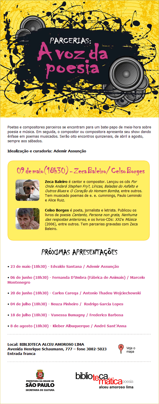 Só se ouvindo pode crer em tanta beleza. Em música, há também Americana, letra de CB inspirada em Bob Dylan (veja o clipe abaixo) e musicada por Zeca Baleiro (em Música ainda com participações de Fernando Abreu e Vitor Ramil), que certamente deverá cantá-la no encontro histórico cujo serviço o e-flyer abaixo dá.