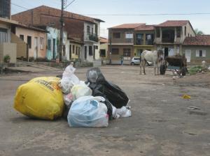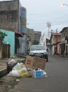Aqui, distante menos de 30 metros da outra pilha, mais um monte de sacos de lixo. Se chove, o que não tem sido raro na capital maranhense, a rua 21 de abril enche (algumas casas por lá também, o jumento, coitado, não sabe nadar), bem como a Padre Anchieta, rua paralela que não aparece em nenhuma dessas fotos.