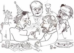 Crentes de que não será a sua última ceia, os convivas devoram com avidez as costelas indigentes da ética e do decoro, lambendo o sangue nos dedos coalhados de anéis. Vomitam uns nos outros como cães hidrófobos, soltando arrotos e peidos estridentes. Apesar do cheiro quase sólido de enxofre no ar, salvaram-se as regalias, como os saques indenizatórios ao tesouro público para despesas secretas de tapioquinhas, ou linhas aéreas para os paraísos da impunidade.