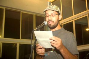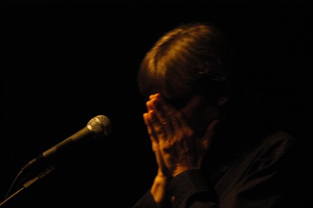 [O blogueiro lê (até de olhos fechados) o chamamento que escreveu para anunciar Rui Mário ao palco. Foto: Pedro Araújo]