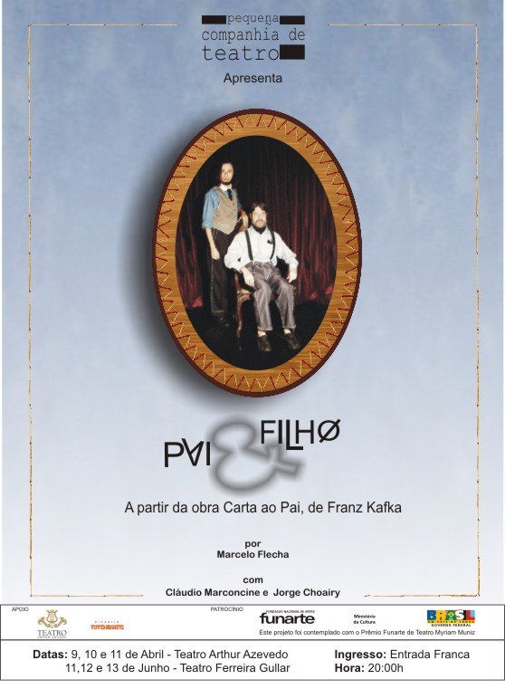 Baseado em Carta ao pai, de Kafka, Pai e filho, com Cláudio Marconcine e Jorge Choairy, será apresentada dias 9, 10 e 11 no Teatro Arthur Azevedo, sempre às 20h. A direção é de Marcelo Flecha. Entrada franca. O espetáculo foi contemplado no Prêmio Miryan Muniz, da Funarte, em 2010. Depois da Ilha, a peça será encenada em Imperatriz, Balsas e Riachão.