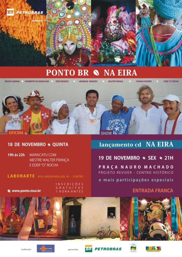 Renata Amaral – Ponto é o nome dado aos cantos de diversos batuques de nossas manifestações populares, e é arte brasileira de primeira grandeza. Formado por músicos contemporâneos e mestres da cultura tradicional, o Ponto BR propõe o espaço da arte como local de encontro e diálogo possíveis entre vertentes e gerações, onde diferenças estéticas, temporais e sociais são harmonizadas revelando outra via para o fazer artístico. Experimentando saberes e sonoridades destas tradições, suas possibilidades formais, texturas vocais e instrumentais e o raciocínio estético proposto pelos mestres, Na Eira tem como resultado uma sonoridade única e atemporal. Ponto BR é um coletivo que reúne mestres como Humberto de Maracanã, cantador de bumba boi que deu nome ao Prêmio Culturas Populares do MinC, Walter França, do Maracatu Estrela Brilhante, chefe do baque centenário campeão do carnaval de Recife, e Zezé de Iemanjá, ekedi e caixeira do Divino da Casa Fanti Ashanti, em diálogo comigo, o pernambucano Eder “O” Rocha, o suíço Thomas Rohrer e o maranhense Henrique Menezes, músicos sediados em São Paulo, que além de seus projetos solo, trabalham com grupos e artistas diversos como A Barca, DJ Dolores, Ivaldo Bertazzo, Zélia Duncan, Orquestra Popular do Recife, Nação Zumbi, Mestre Ambrósio, Zeca Baleiro e Chico César, entre outros. Esta investigação estética está fundamentada em uma longa convivência com estas comunidades, sua cultura, seus guardiões, em pesquisas que já renderam dezenas de registros em CD e documentários destas manifestações. Toadas de bumba boi, maracatu, pontos de tambor de mina, jurema, cocos, cirandas, carimbós, rojões e vários outros fazem parte do CD Na Eira. Selecionado pelo Programa Petrobras Cultural, o CD conta também com a participação de Seu Nelson da Rabeca, de Alagoas, o babalorixá Euclides Talabyan, as mestras Maria Rosa e Anunciação Menezes, do Maranhão, o Povo Kariri Xocó, também de Alagoas, e a comunidade da Tenda São José de Pirapemas, no Maranhão, e está sendo lançado em circulação por seis estados brasileiros. Ponto BR realiza também oficinas de gêneros populares como bumba boi, divino, jongo e maracatu nação, em propostas de musicalização e arte-educação. Esculpido pela memória de seus mestres, o repertório de nossos gêneros tradicionais alia a absoluta simplicidade a uma surpreendente elaboração estética que a cultura oral filtra qualitativamente através do tempo. Esses pontos são melodias e ritmos matrizes da nossa música urbana, que influenciaram significativamente a formação de gêneros como o samba, o forró e inúmeros outros. Na Eira revela a sofisticação e a contemporaneidade destas manifestações, através das quais o povo brasileiro veicula e harmoniza sua vocação artística, sua corporalidade, sua espiritualidade.