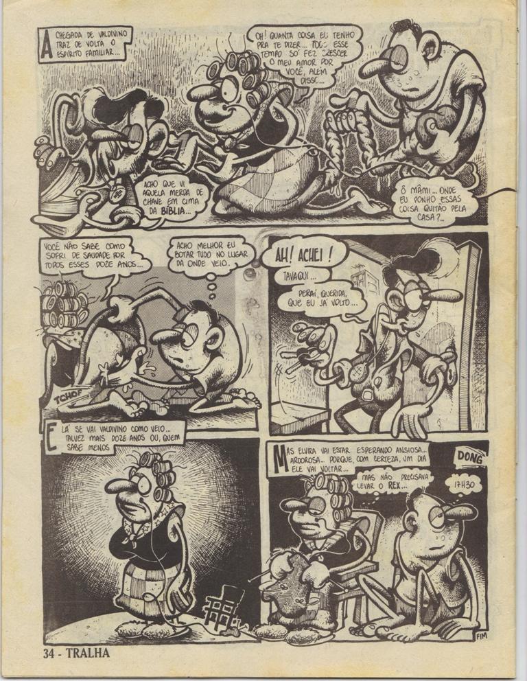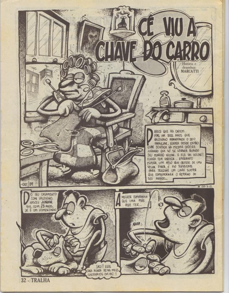 Este número da Tralha, revista de que não tenho maiores informações, trazia também trabalhos de Glauco Mattoso e Lourenço Mutarelli, entre outros nomes. Além da história que postei acima, Marcatti ainda assina o traço de outras páginas.