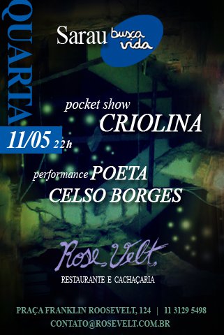Aliás, tripla: o duo Criolina, formado por Alê Muniz e Luciana Simões, se encontra com o poeta Celso Borges, em São Paulo, conforme e-flyer abaixo.