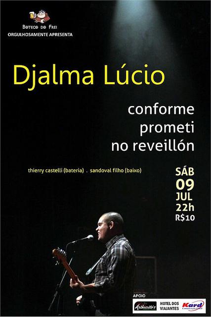Mas por que o blogueiro estaria falando em reveillón em pleno meio de ano? Para avisar-lhes que hoje à noite quem toca no Boteco do Frei é o mui talentoso Djalma Lúcio, que apresenta o show Conforme prometi no reveillón, em que canta coisas de seu ótimo epônimo, dos tempos de Catarina Mina (banda que integrou com Bruno Azevêdo e Eduardo Patrício), inéditas e covers.