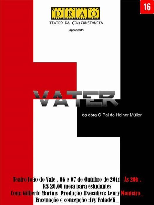 Do release que recebi por e-mail: “Vater é uma livre adaptação da obra O Pai, do dramaturgo alemão Heiner Müller, baseada na sua vivência de quando criança ao ver seu pai ser preso por volta de 1933 por não seguir mais o Partido Social Democrata Alemão e sim o Partido Socialista Operário. O autor penetra com seus escritos em esferas bastante contradotórias com o contexto político-social e cultural da RDA e ao mesmo tempo sobre uma esfera abrangente de onde brota uma arte de vanguarda conhecida no mundo todo”.