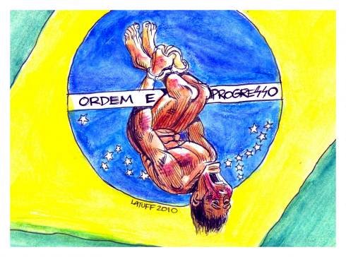 Latuff é um gênio! Menos conhecido no Brasil que fora dele, nem sei dizer se infelizmente. Lá fora tem cumprido utilíssimo papel ao fazer críticas bem humoradas com seus traços e cores a diversos acontecimentos políticos. De sua arte também não escaparam episódios nacionais como o massacre de Pinheirinho, em São Paulo, e a ocupação do Morro do Alemão, no Rio de Janeiro, apenas para citar alguns dos mais recentes. Quem quiser saber e ver mais do trabalho do rapaz, basta acessar seu blogue, o dele, digo.