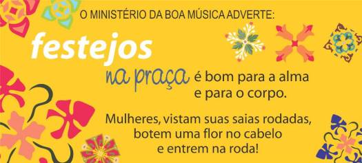 É por isso que o Ministério da Boa Música adverte: Festejos na Praça faz bem para a alma e para o corpo. Mulheres, vistam suas saias rodadas, botem uma flor no cabelo e entrem na roda!