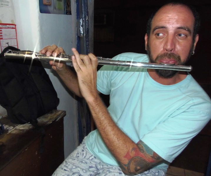 O que te motivou? Quem foi a pessoa que fez com que você se decidisse a tocar flauta? Foi um cara chamado Fabiano, que já tá lá com papai do céu já. Morreu muito novo, um cara que eu conheci em Campina Grande, era de Maceió. Era um cara surpreendente, tocava violão, baixo, teclado, bateria, trabalhava com tudo isso, e flauta também. Certa vez a gente na casa dele, eu e Madian, tocando lá, Djavan, um monte de música, ele pegou a flauta, começou a destruir, tocando um monte de coisas, tinha várias flautas doces na casa dele. Eu fiquei encantado e falei: “pô, Fabiano, como é que a gente faz aqui?” Ele falou: “não tem segredo, é só ouvido”. Eu fiquei mais encucado ainda, meio com raiva dele. Eu pensei: “esse cara toca pra caramba, não quer ensinar, dar um toque pros amigos”. Quando eu peguei a primeira flauta doce, que eu fui entender o que ele quis dizer lá atrás. Esse cara, esse encontro, esse dia foi que [interrompe-se]. Depois disso eu cheguei, fui pesquisar os flautistas, fui ajudado por muita gente.