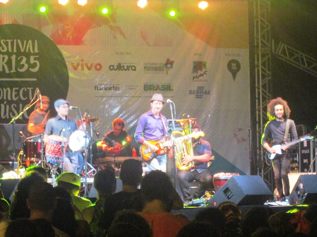 Que Curumin sabe o que fazer no palco, o show dele ontem (11), na programação do Festival BR135, sua primeira vez em São Luís, não deixou a menor dúvida. Pilotando bateria e samples, trajando calça vermelha, chapéu e uma camisa quase nas cores do Sampaio Corrêa (o laranja predominava, em vez do vermelho), o artista estava escoltado pelos Aipins José Nigro (contrabaixo e samples) e Lucas Martins (guitarra e samples), “uma banda que tá há muito tempo tocando junta”, como revelou em entrevista ao Homem de vícios antigos.
