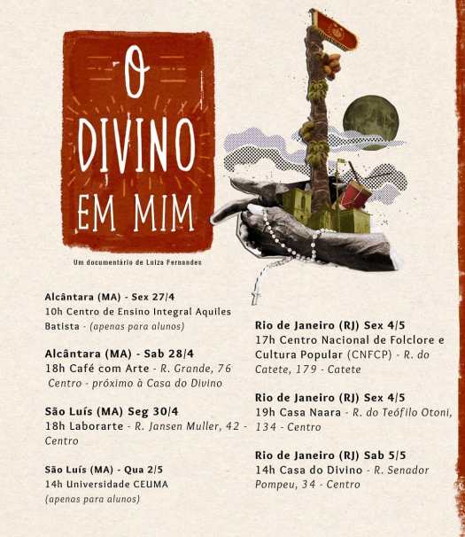 O documentário foi realizado pela maranhense Luiza FC como trabalho de conclusão do curso de Jornalismo da USP. Sábado passado (28), às vésperas do início de mais uma Festa do Divino, o filme foi exibido em Alcântara, no Café com Arte (Rua Grande, 76, próximo à Casa do Divino). Hoje (30), às 18h, O Divino em mim será exibido no Laborarte (Rua Jansen Müller, 42, Centro), com entrada franca.