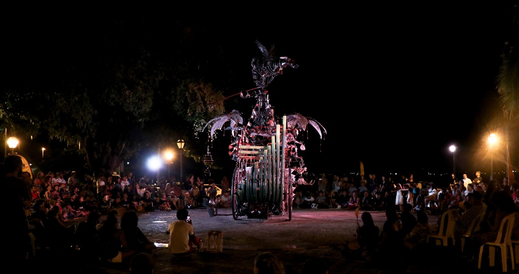 Não há uma palavra em Automákina – Universo deslizante, apresentado ontem (2) na Praça da Casa do Maranhão. Espetáculo/instalação, uma engenhoca gigante, com que contracena Luciano Wieser, o Duque de Hosain’g, misto de carroça e castelo, é abrigo de um misto de bruxo (com os cabelos a la Ravengar), cientista louco e pescador.
