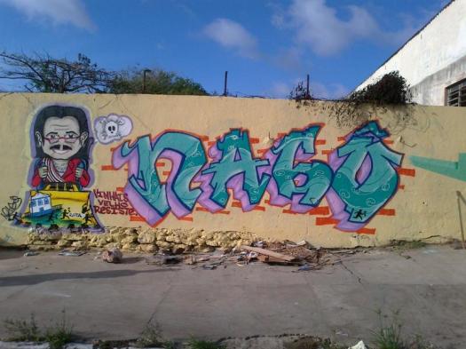 Abaixo, duas fotos do muro, a segunda uma espécie de close da primeira (é ou não é genial?). Quem quiser sacar a arte in loco, é só passar ali pela Av. Kennedy, na altura da entrada do Bairro de Fátima.