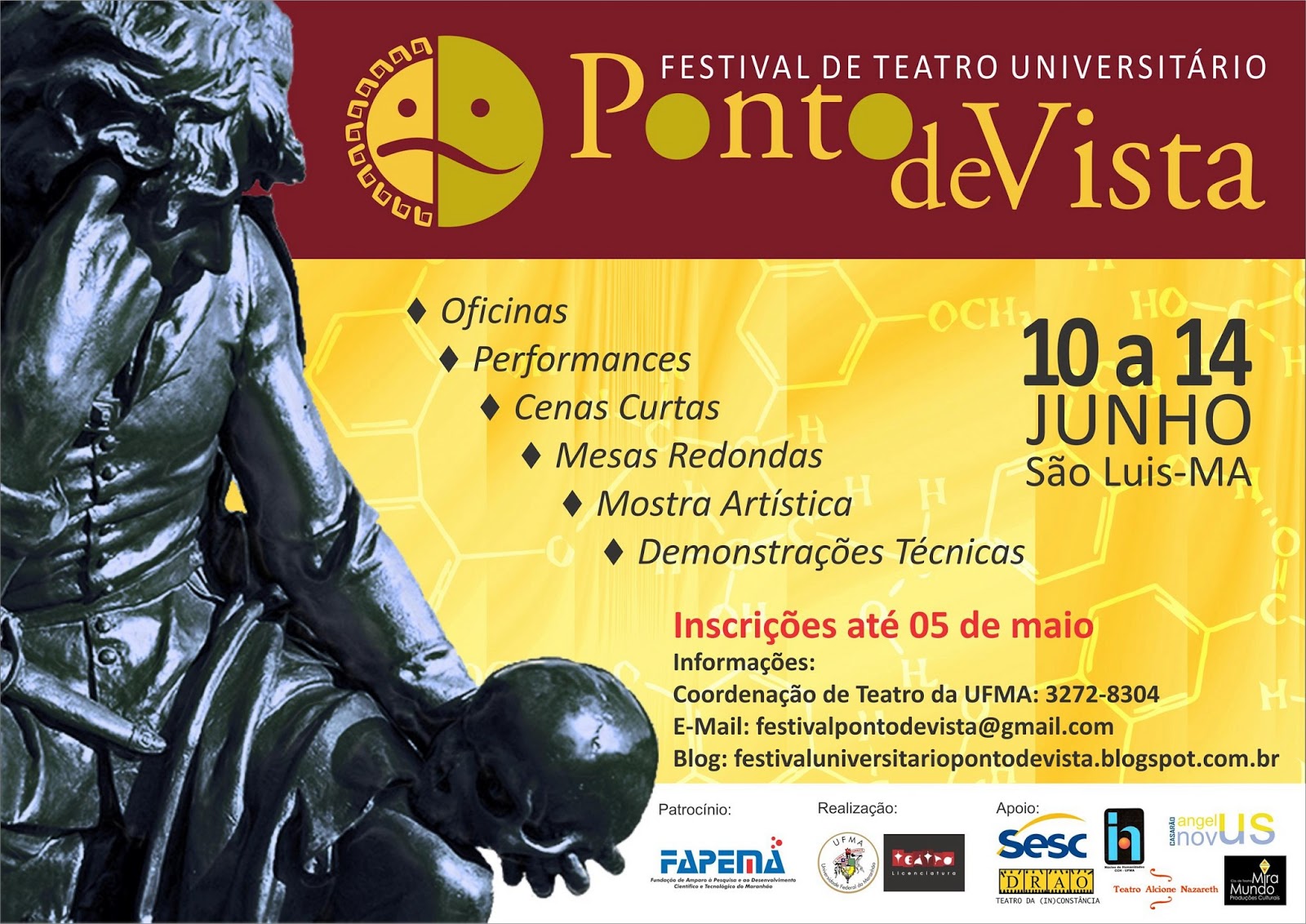 Com um curso de licenciatura na área, a Universidade Federal do Maranhão (UFMA) realizará entre os próximos dias 10 a 14 de junho seu I Festival Universitário de Teatro. Batizado de Ponto de Vista, é o que o mesmo pretende apresentar, integrando as comunidades acadêmica e não acadêmica.