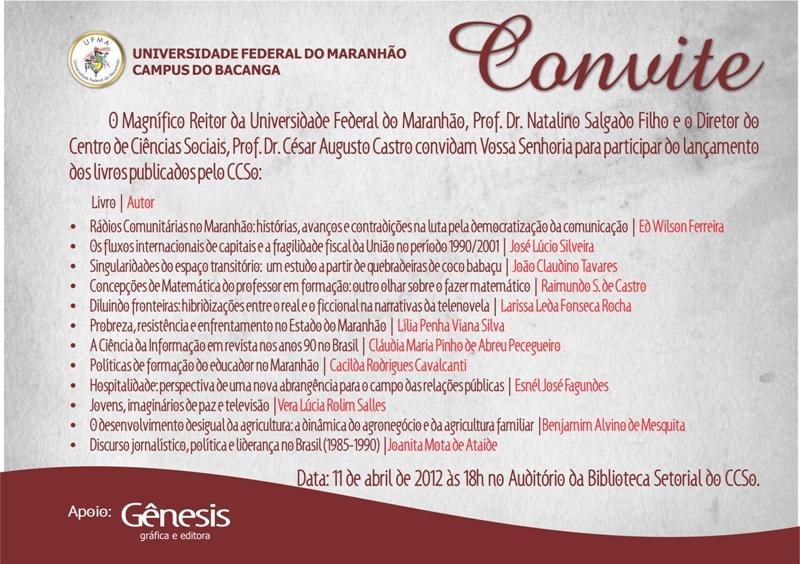 O convite é feião (como parece “ter” que ser qualquer coisa que tenha alguma oficialidade) e traz erros nos títulos das obras publicadas pelo Centro de Ciências Sociais (CCSo) da Universidade Federal do Maranhão (UFMA), o que, a meu ver, pega muito mal. Desejo aos livros melhor sorte, em ambos os aspectos (revisão & projeto gráfico).
