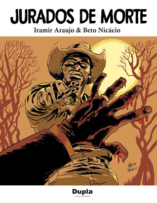 Uma das histórias de Jurados de morte [Dupla Criação/7 Cores Gráfica e Editora, 2017, 26 p.; pedidos pelo e-mail teclandocomadupla@gmail.com ou telefone (98) 3227-7688] parte da sobrevivência inusitada de Cara de Cão, um cangaceiro cujo nome, pelas mãos e imaginações de Iramir Araújo e Beto Nicácio, autores da HQ, remonta a Cara de Cavalo, da icônica bandeira “seja marginal, seja herói” do artista plástico pré-tropicalista Hélio Oiticica.