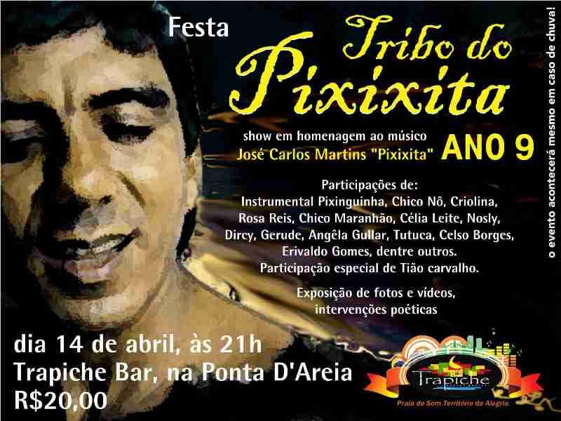 José Carlos Castro Martins (1/4/1952-12/4/2002), o Pixixita, ganha mais um tributo neste sábado (13), às 20h, no Trapiche (Ponta d’Areia). Mais que um tributo, aliás, a Tribo do Pixixita é uma grande festa que congrega amigos e admiradores do saudoso músico.